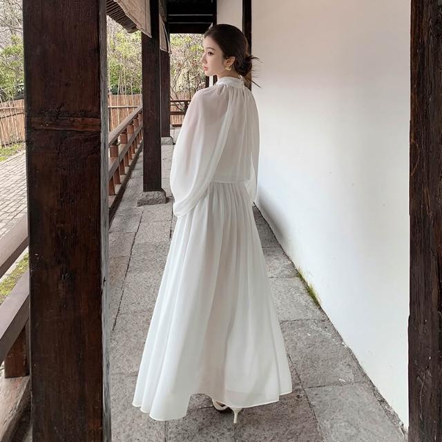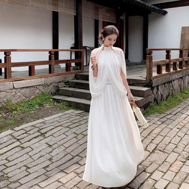 Seven七- 聖托裏尼漫夏雪紡半高領披肩上衣收腰大擺裙套裝