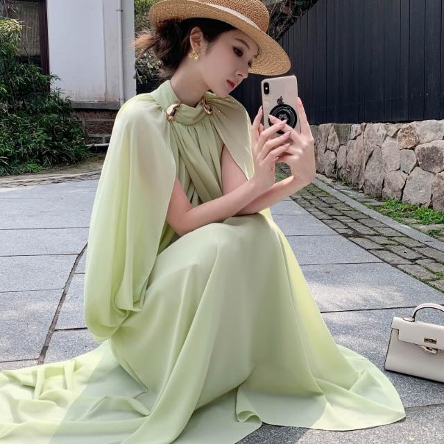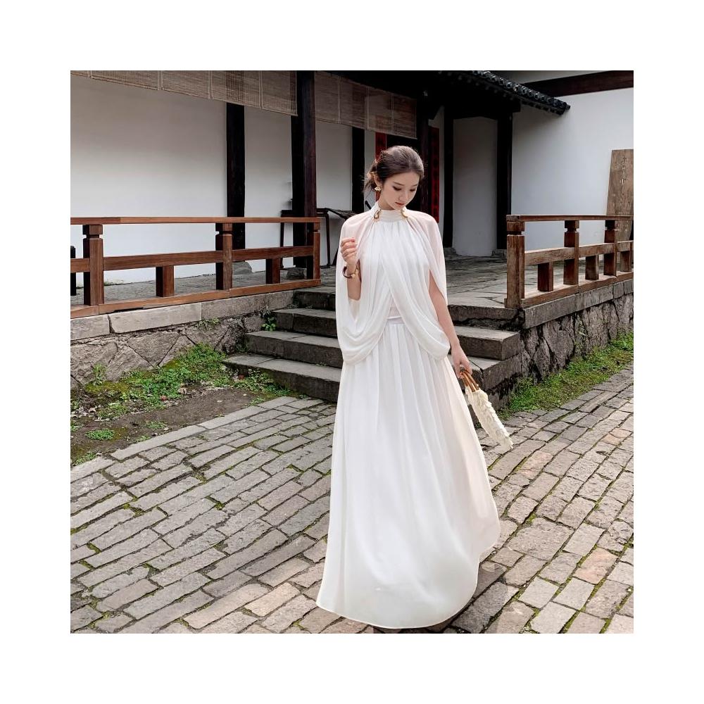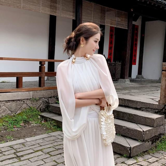 Seven七- 聖托裏尼漫夏雪紡半高領披肩上衣收腰大擺裙套裝