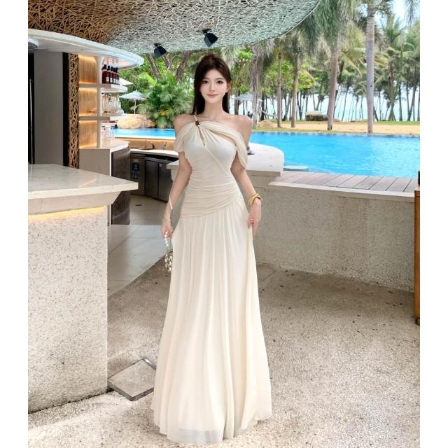 Seven七- 清冷矜雅法式氛圍感斜肩扭結設計長裙性感純欲連衣裙