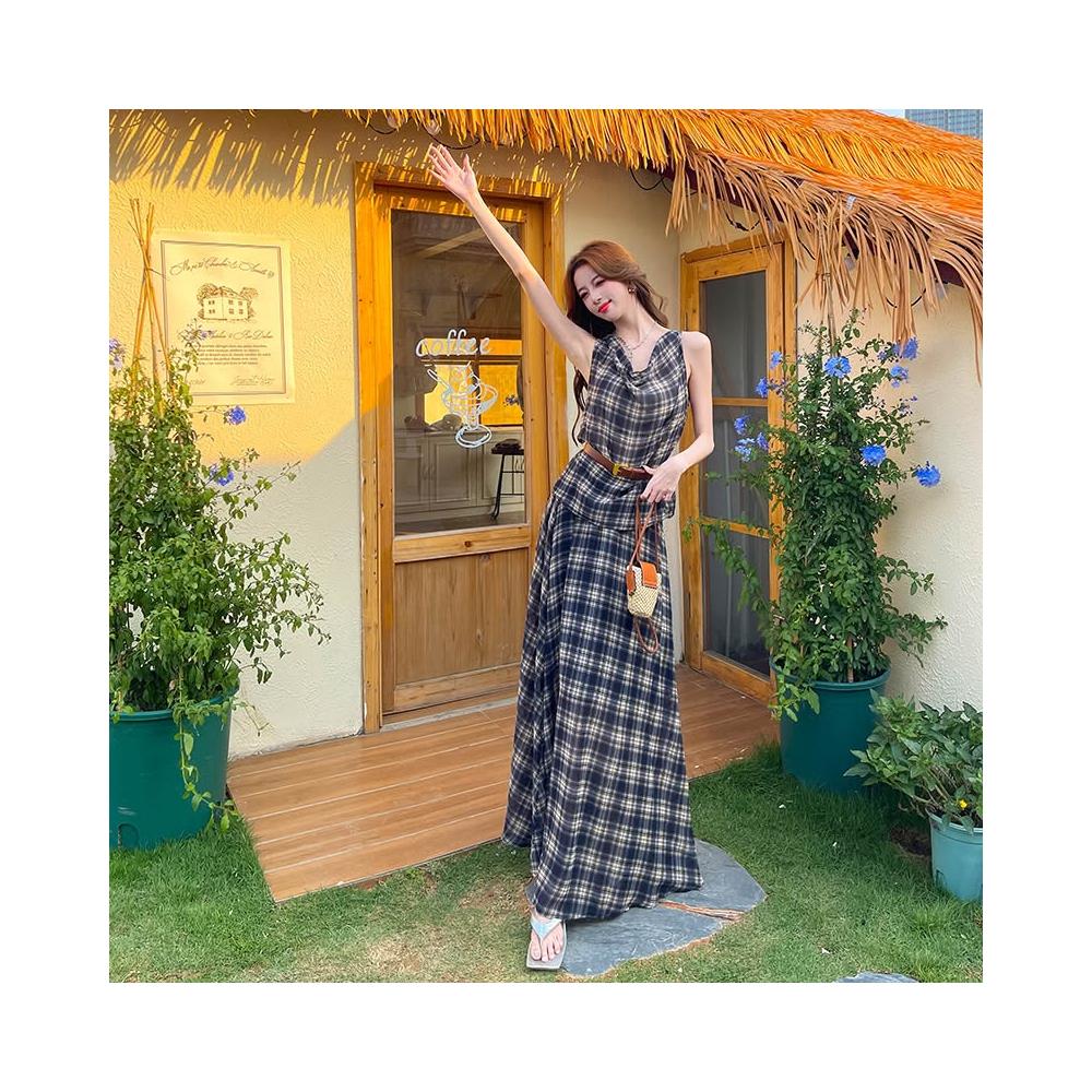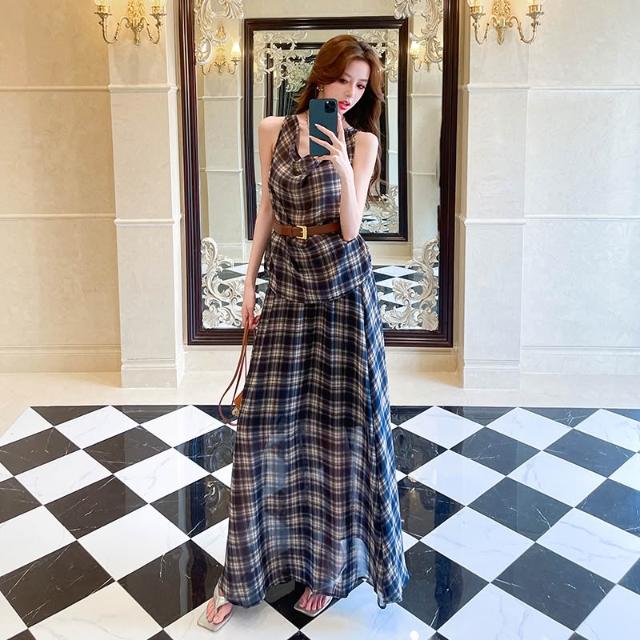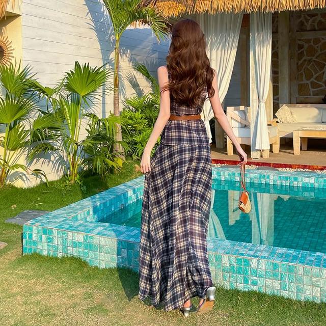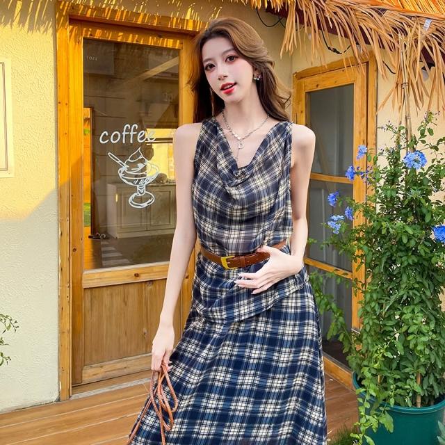 Seven七- 法式辣妹復古格子蕩領背心上衣女高腰半身長裙套裝連衣裙