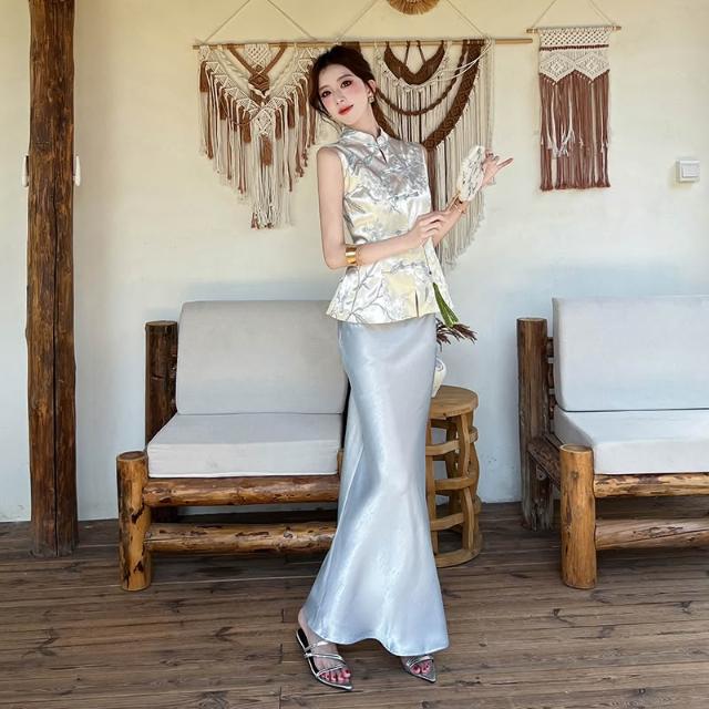 Seven七- 木子李的李新中式水墨國風無袖緞面提花上衣垂感魚尾半身裙套裝夏