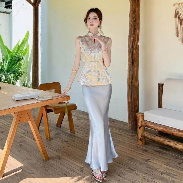 Seven七- 木子李的李新中式水墨國風無袖緞面提花上衣垂感魚尾半身裙套裝夏