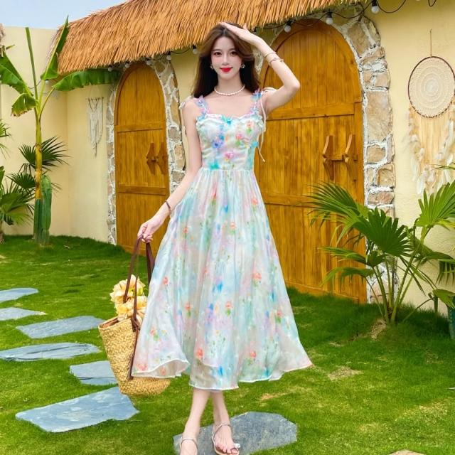 Seven七- 蝴蝶油畫少女長款印花收腰a字吊帶連衣裙夏季法式氣質高級感裙子