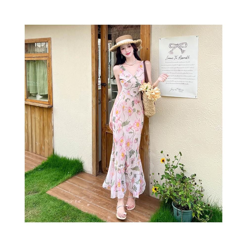 Seven七- 法式氣質度假風V領斜裁溫柔粉碎花春季無袖收腰連衣裙