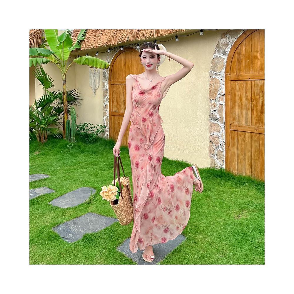 Seven七- 花開半夏粉色碎花雪紡吊帶連衣裙女氣質長裙收腰裙子