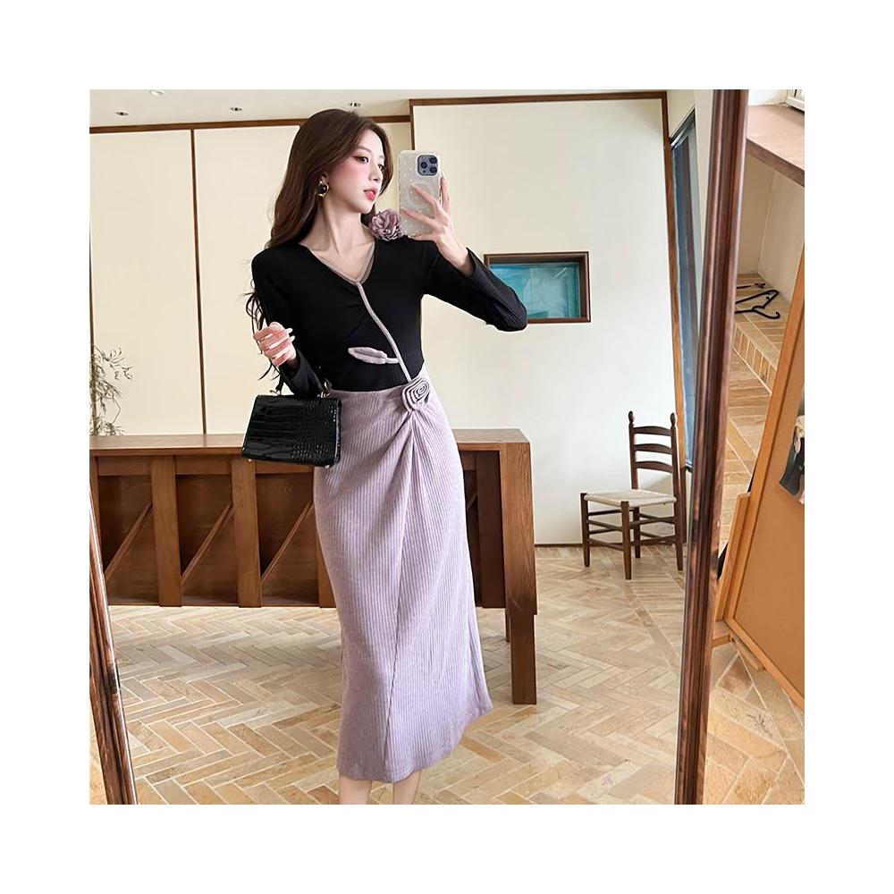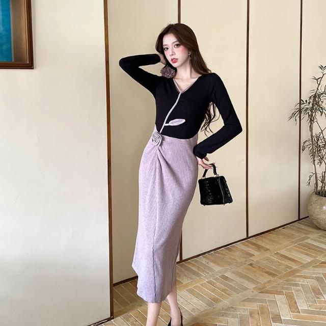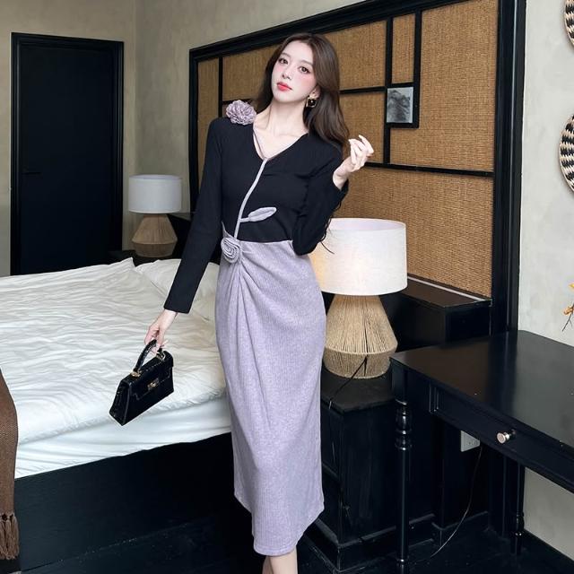 Seven七- 秋冬法式氣質V領立體花朵減齡拼接撞色收腰顯瘦連衣裙