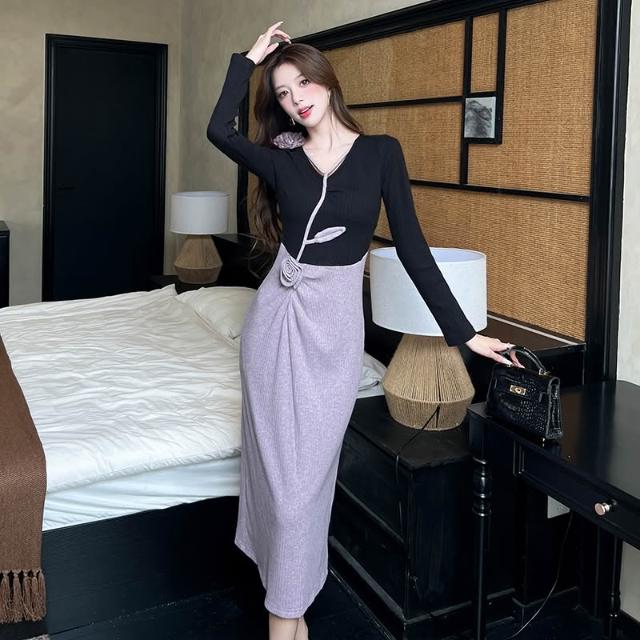 Seven七- 秋冬法式氣質V領立體花朵減齡拼接撞色收腰顯瘦連衣裙