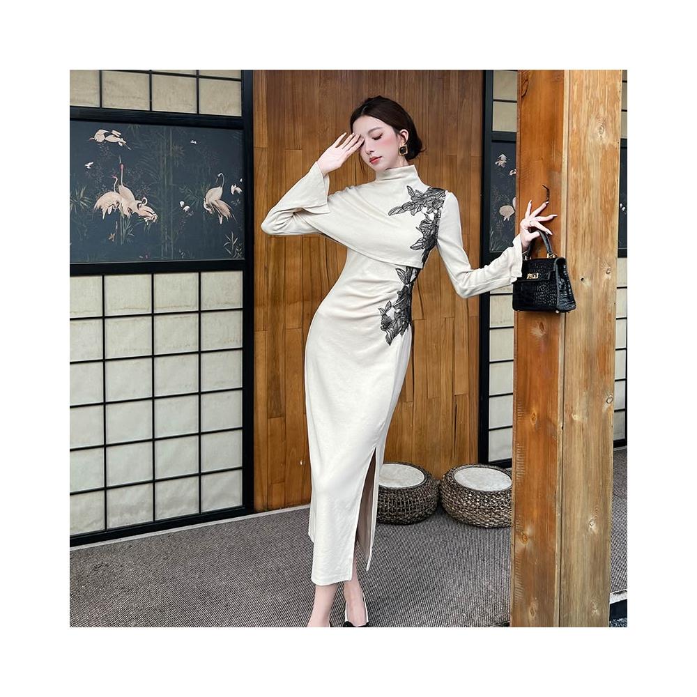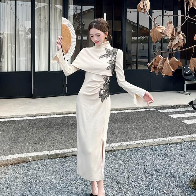 Seven七- 秋楓敘新中式針織連衣裙女早秋法式鬥篷披肩長袖旗袍長裙