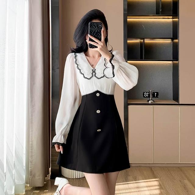 Seven七- 蕾絲邊娃娃領重工釘鉆黑白拼接絕美減齡長袖連衣裙