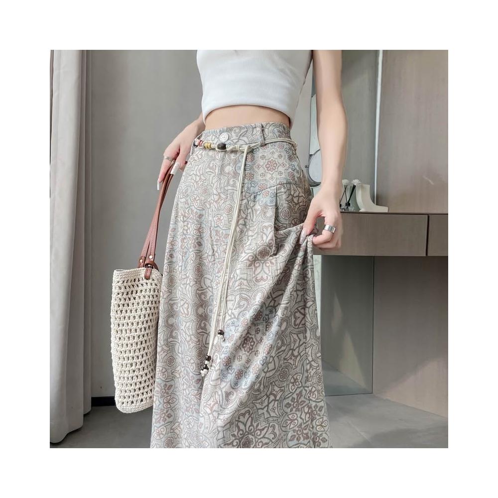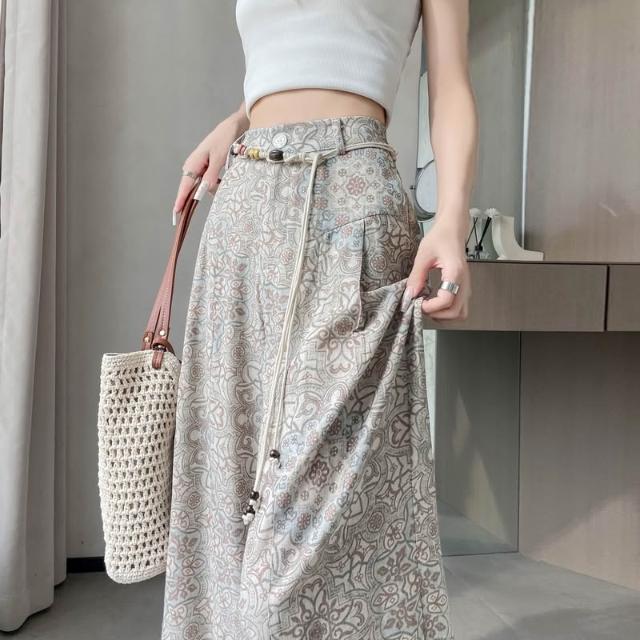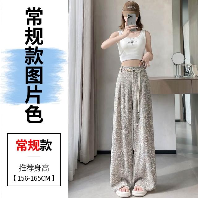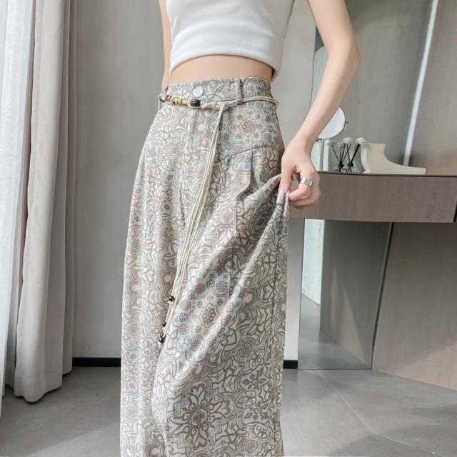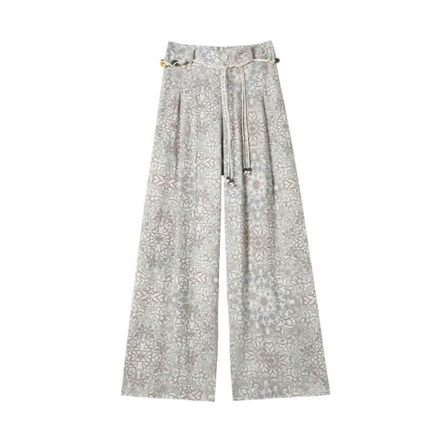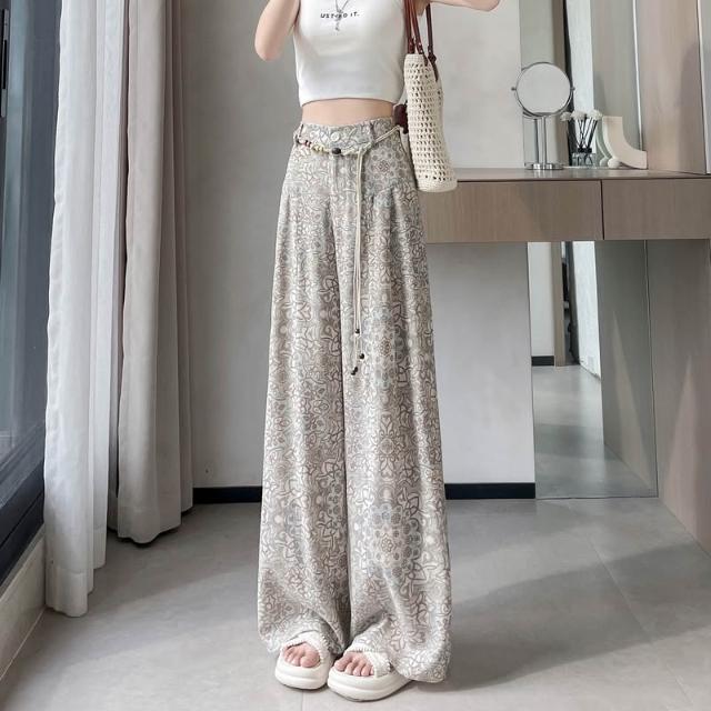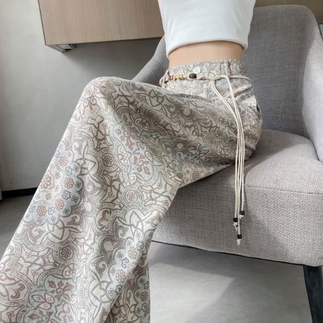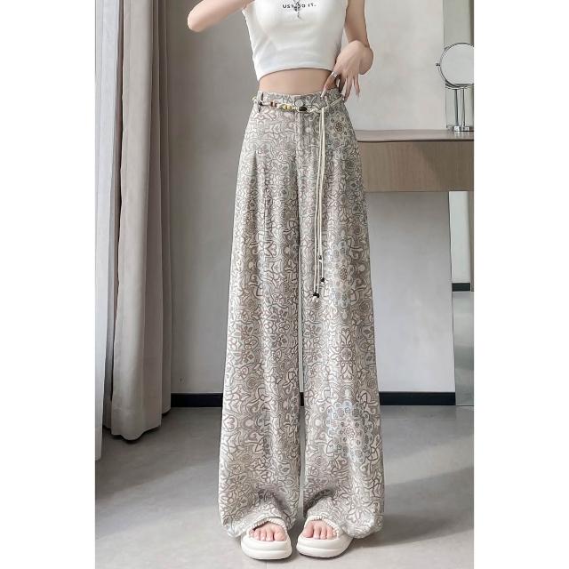 Seven七- .2026夏季新款印花天絲亞麻闊腿褲高腰棉麻防曬拖地褲女