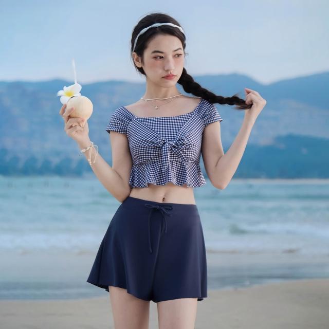Seven七- 日韓小香風分體裙式泳衣女2026新款甜美少女一字肩千鳥格溫泉泳裝