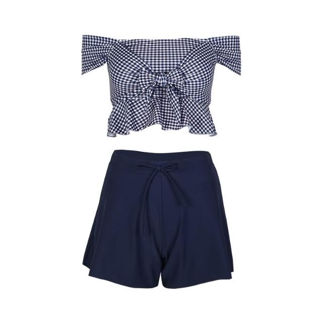 Seven七- 日韓小香風分體裙式泳衣女2026新款甜美少女一字肩千鳥格溫泉泳裝