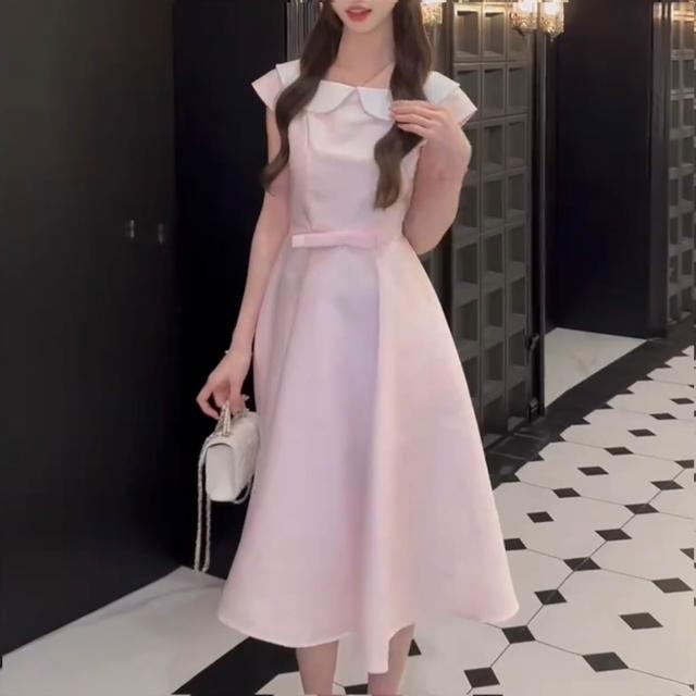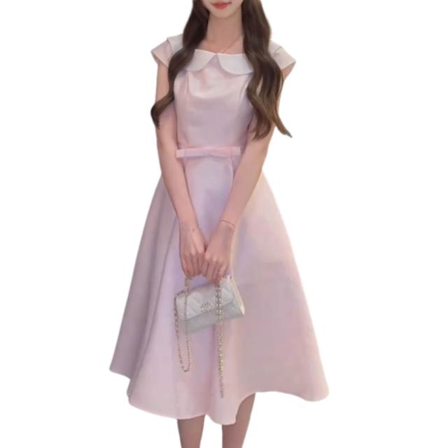 Seven七= 法式氣質娃娃領粉色連衣裙子女2026春夏季巨好看收腰顯瘦減齡長裙