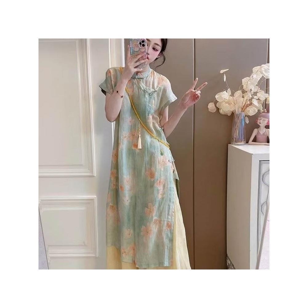 Seven七= 清冷風盤扣斜門襟新中式女中長款連衣裙夏季文藝茶服側開叉袍子