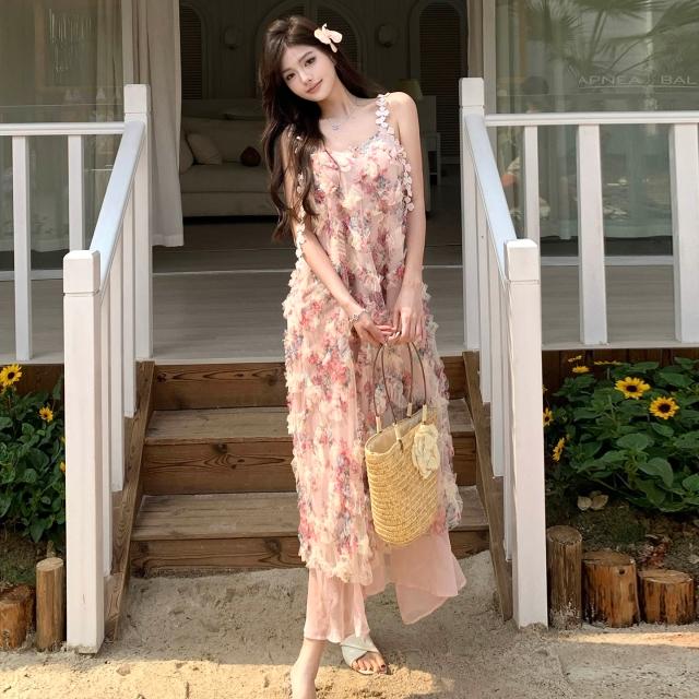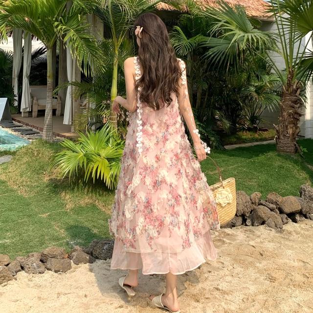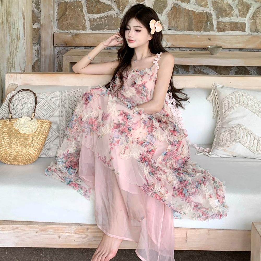 Seven七= 粉色絕美浪漫風木耳邊碎花連衣裙夏季新款超仙少女感吊帶裙沙灘裙