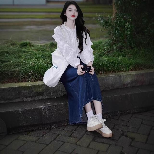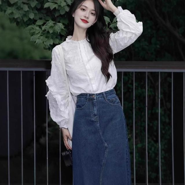 Seven七- 2026年春季新款法式復古設計感荷葉邊長袖立領襯衫重工繡花上衣女