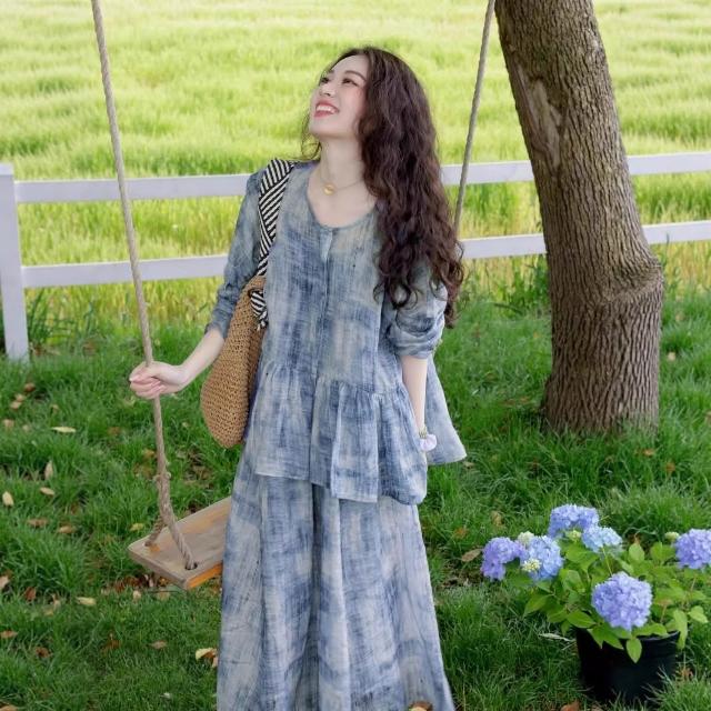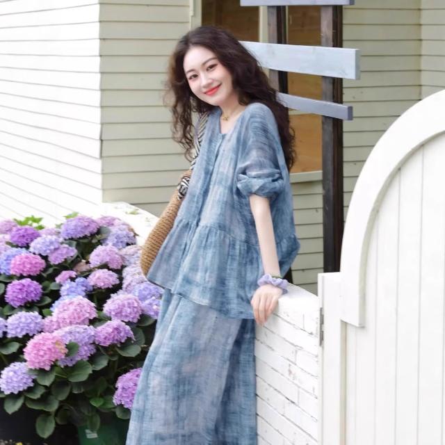 Seven七- 2026春夏款兩件套 苎麻印花襯衫上衣吊帶連衣裙B0423長裙