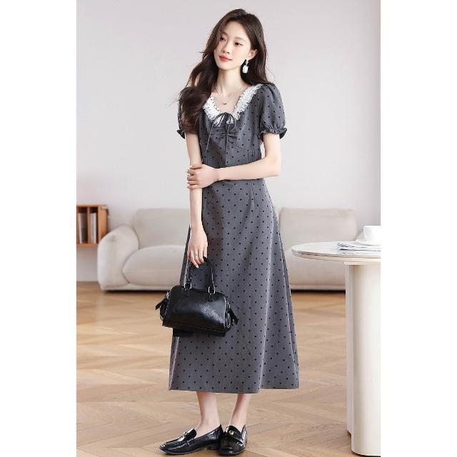 Seven七- . 鹽系少女2026灰色連衣裙女夏季梨形收腰設計感波點裙