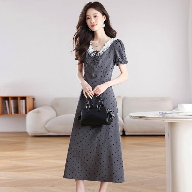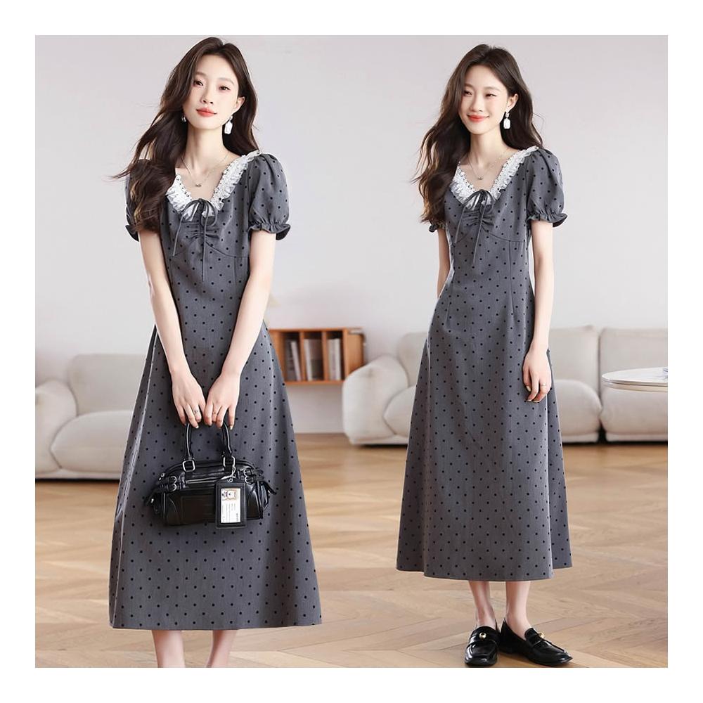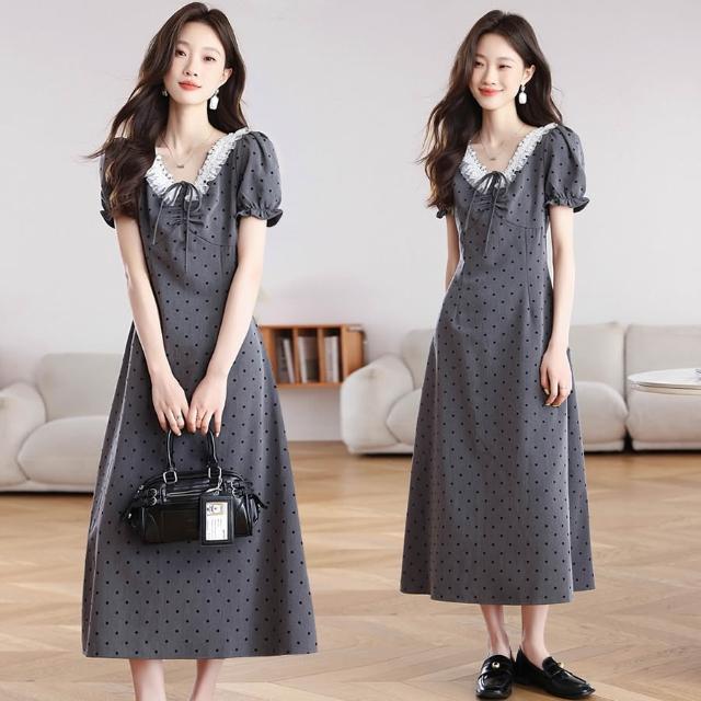 Seven七- . 鹽系少女2026灰色連衣裙女夏季梨形收腰設計感波點裙