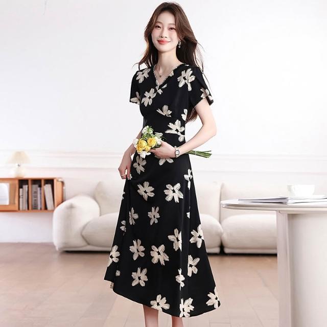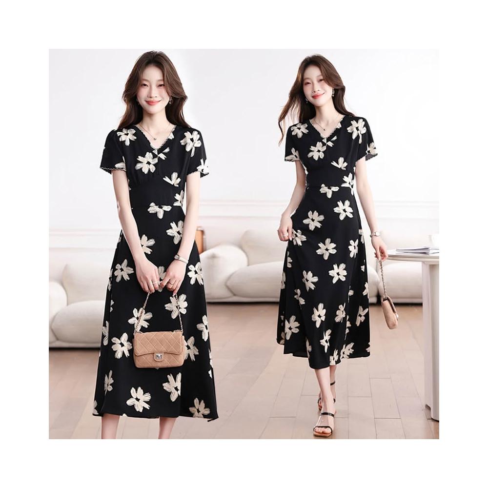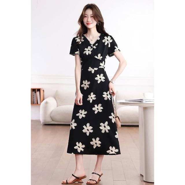 Seven七- .大碼胖MM法式復古氣質碎花連衣裙女夏新款收腰顯瘦a字長裙子