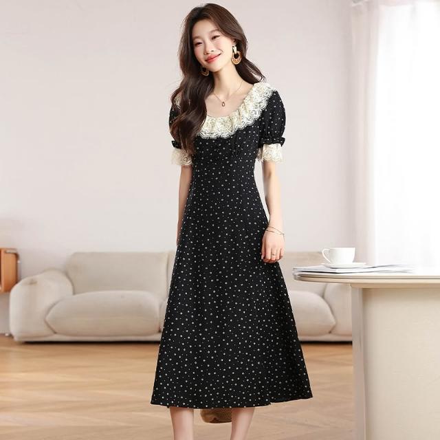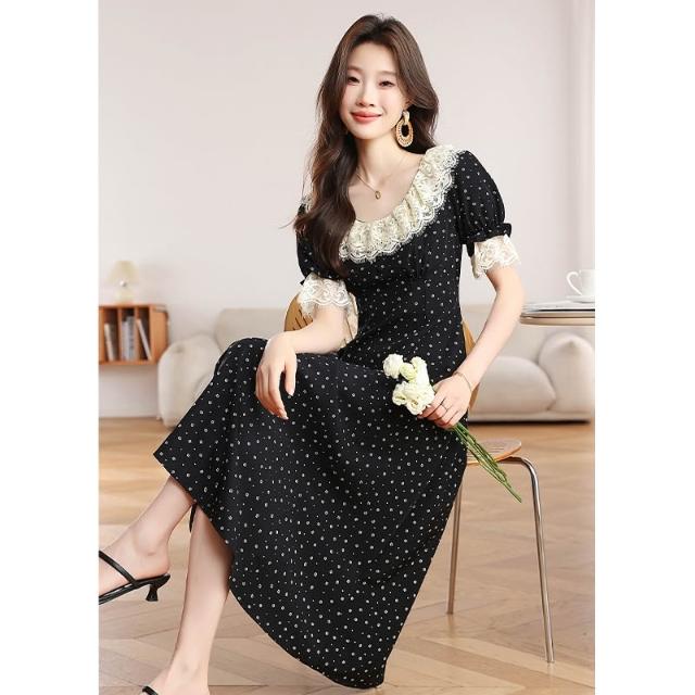 Seven七- . 法式荷葉領碎花連衣裙春夏新款女裝中長款黑色短袖茶歇裙T