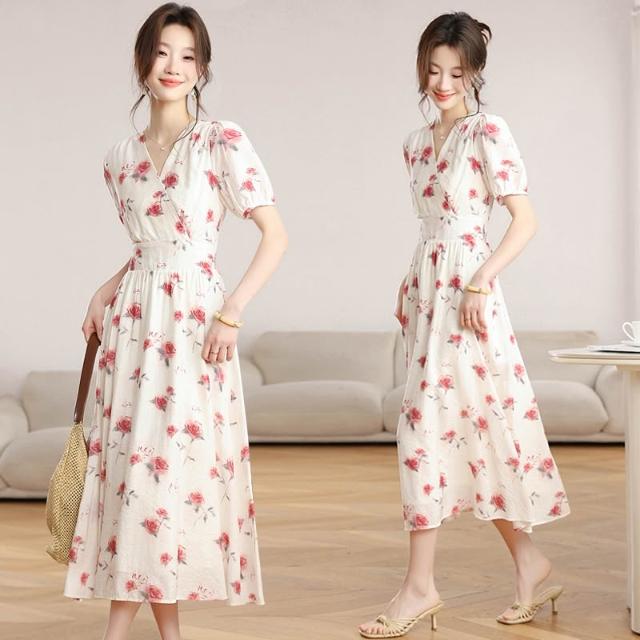 Seven七- . 泡泡袖V領碎花連衣裙女夏季收腰顯瘦高級感度假風氣質長裙