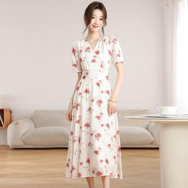 Seven七- . 泡泡袖V領碎花連衣裙女夏季收腰顯瘦高級感度假風氣質長裙