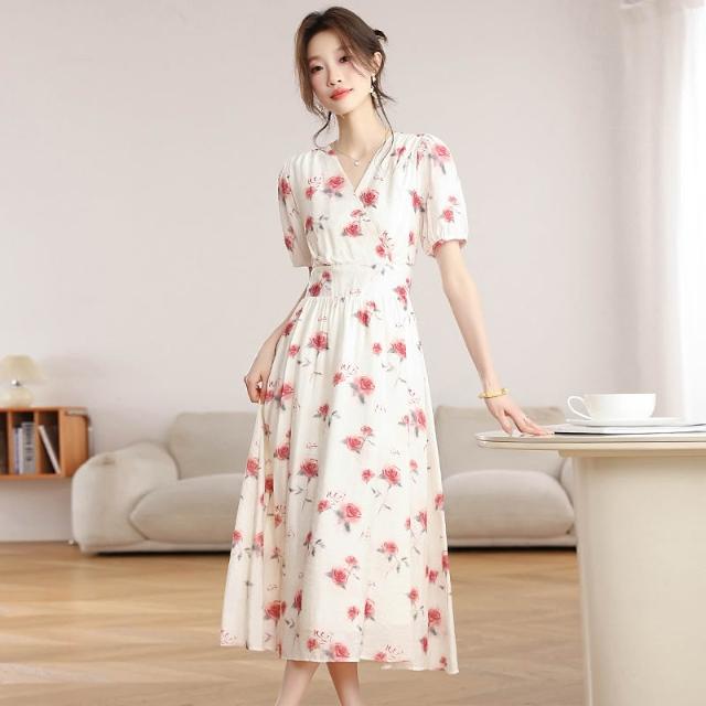Seven七- . 泡泡袖V領碎花連衣裙女夏季收腰顯瘦高級感度假風氣質長裙