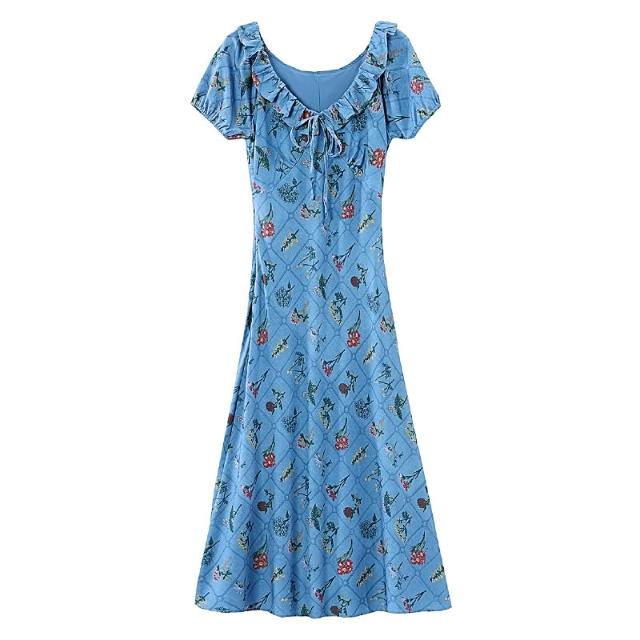 Seven七- .2026春夏新款法式藍色斜裁顯瘦荷葉領收腰短袖氣質連衣裙