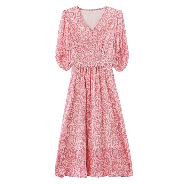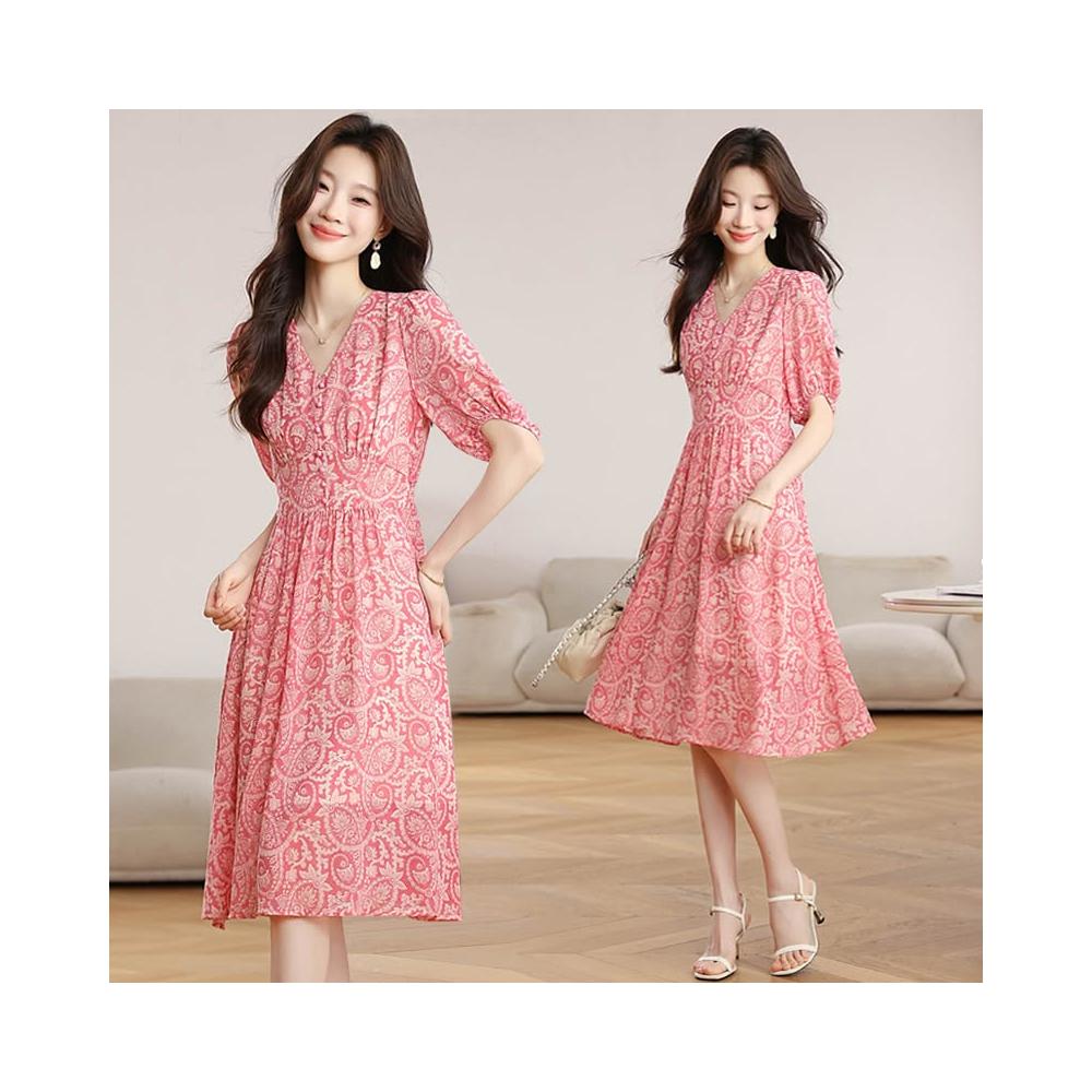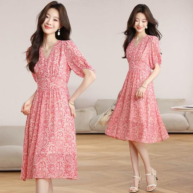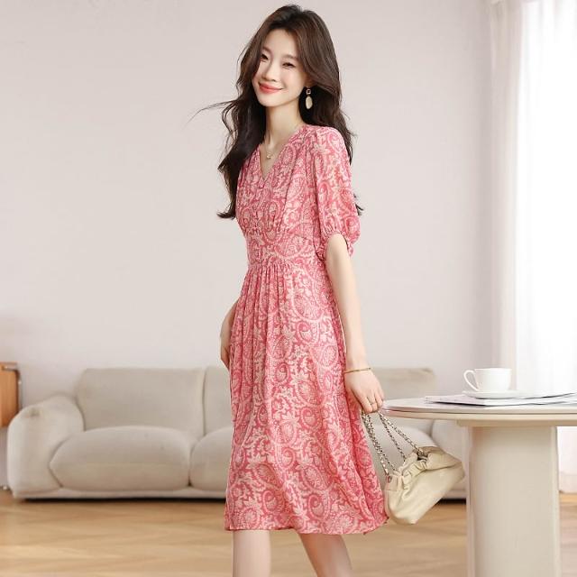 Seven七- .小個子夏季短袖雪紡碎花連衣裙新款v領修身氣質顯瘦a字裙子女