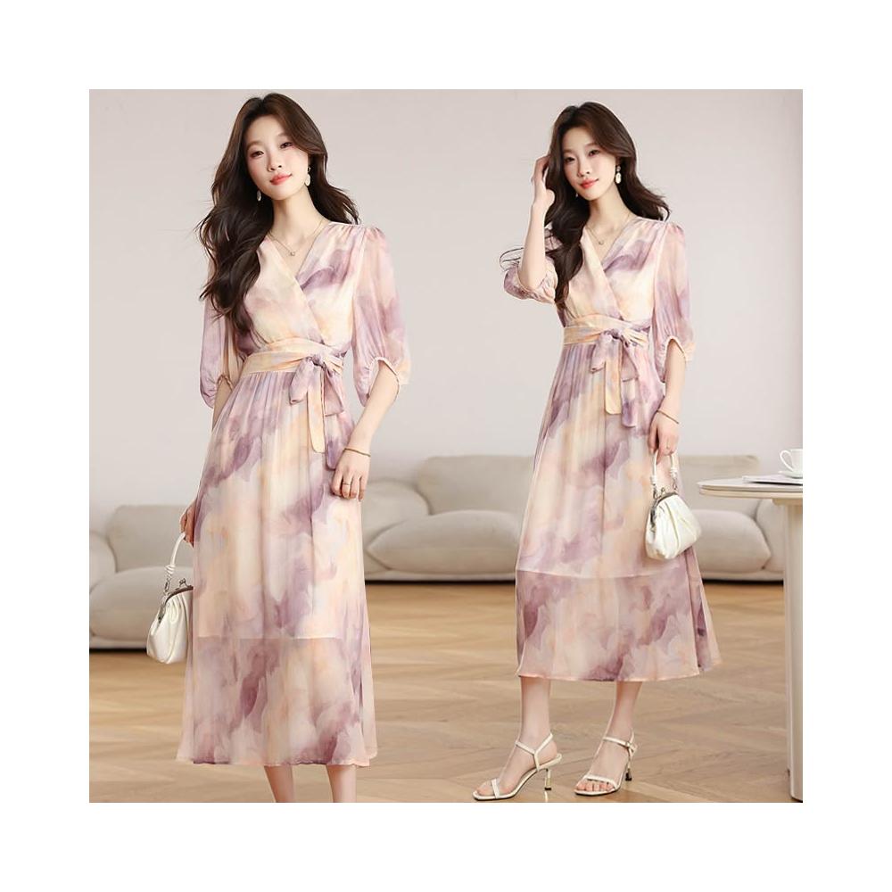 Seven七- .碎花連衣裙女夏季新款設計感氣質收腰顯瘦茶歇法式系帶長裙子