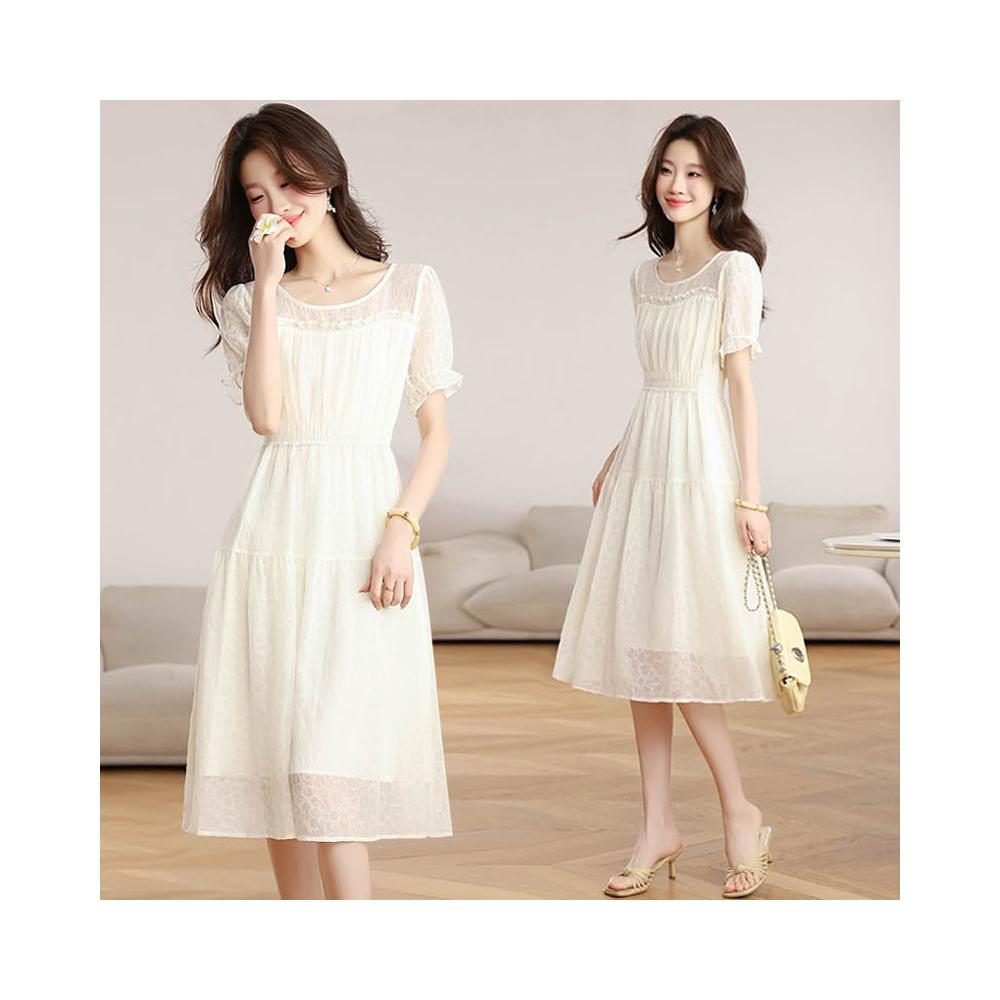 Seven七- .小個子白色雪紡連衣裙女新款夏季氣質圓領收腰遮肚子a字裙子