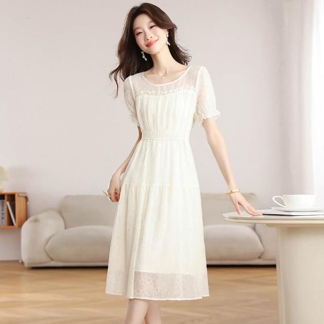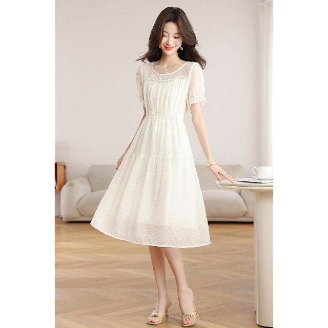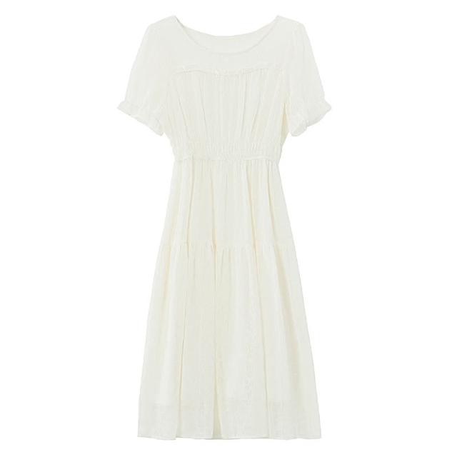 Seven七- .小個子白色雪紡連衣裙女新款夏季氣質圓領收腰遮肚子a字裙子