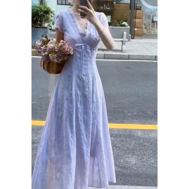 Seven七- 紫色荷葉邊法式連衣裙子女夏季2026新款收腰飛飛袖溫柔風氣質長裙
