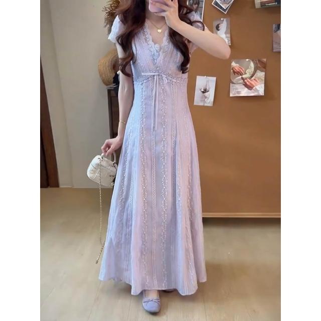 Seven七- 紫色荷葉邊法式連衣裙子女夏季2026新款收腰飛飛袖溫柔風氣質長裙