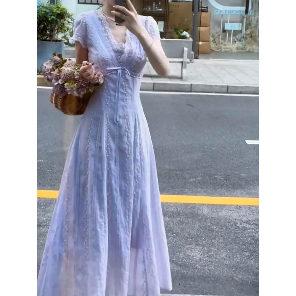 Seven七- 紫色荷葉邊法式連衣裙子女夏季2026新款收腰飛飛袖溫柔風氣質長裙