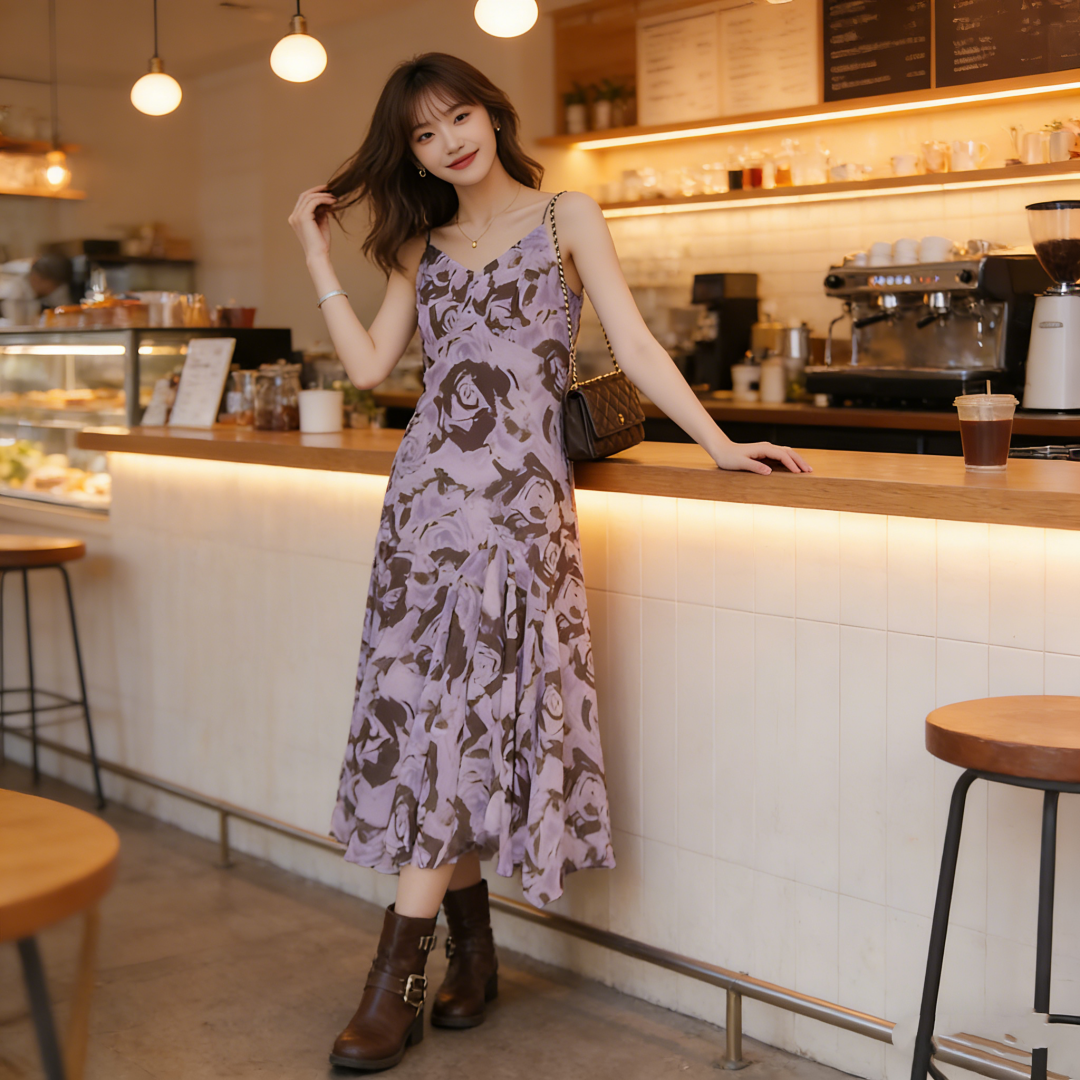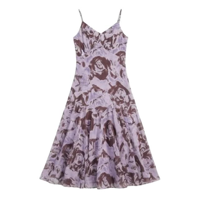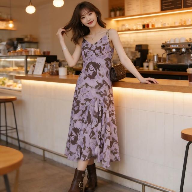 Seven七- 海邊度假紫色印花吊帶連衣裙2026夏季韓系chic特別漂亮掐腰小裙子