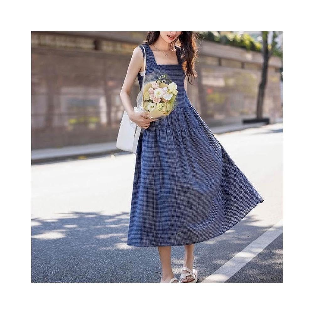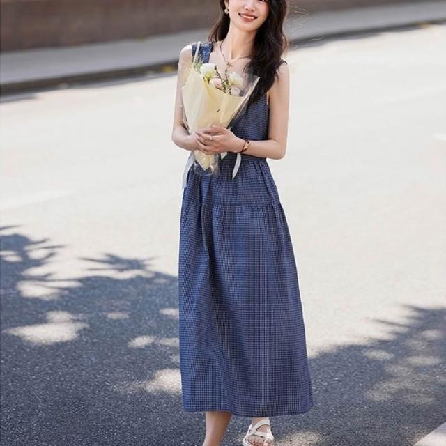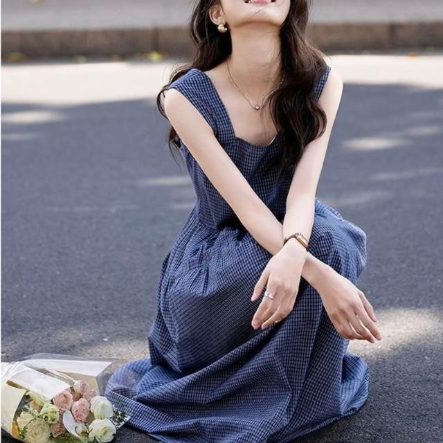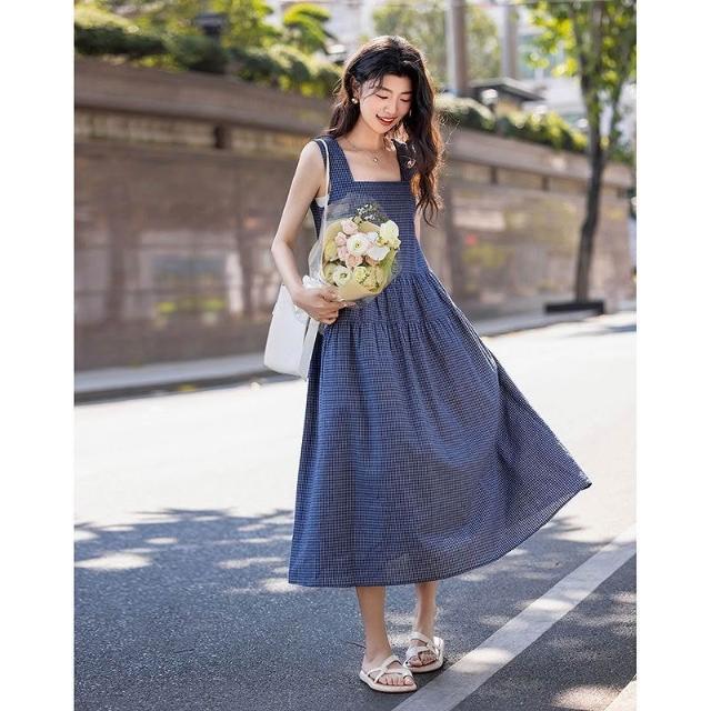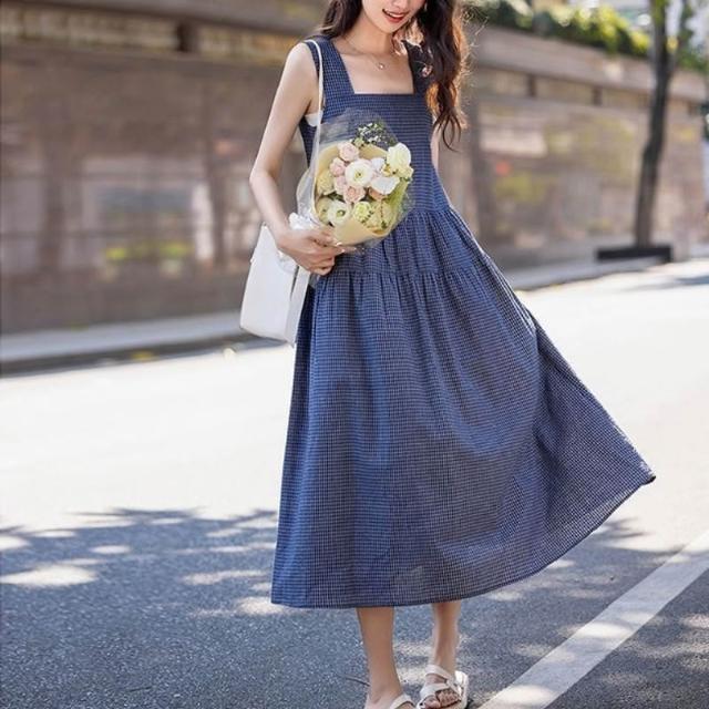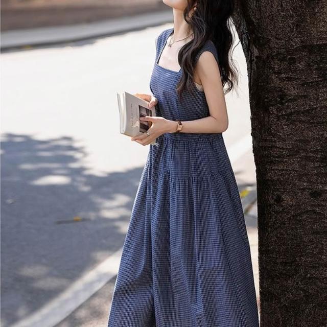 Seven七- 2026夏季新款日系淡顏方領格紋氣質A字長款拼接寬松顯瘦連衣裙女