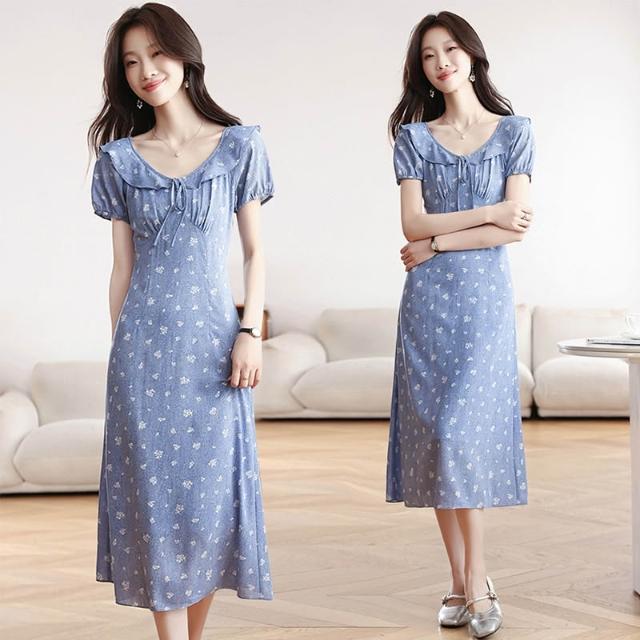 Seven七- . 碎花連衣裙2026夏季新款女裝泡泡袖收腰V領仿牛仔日系娃娃裙