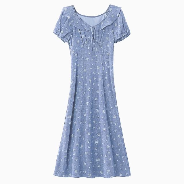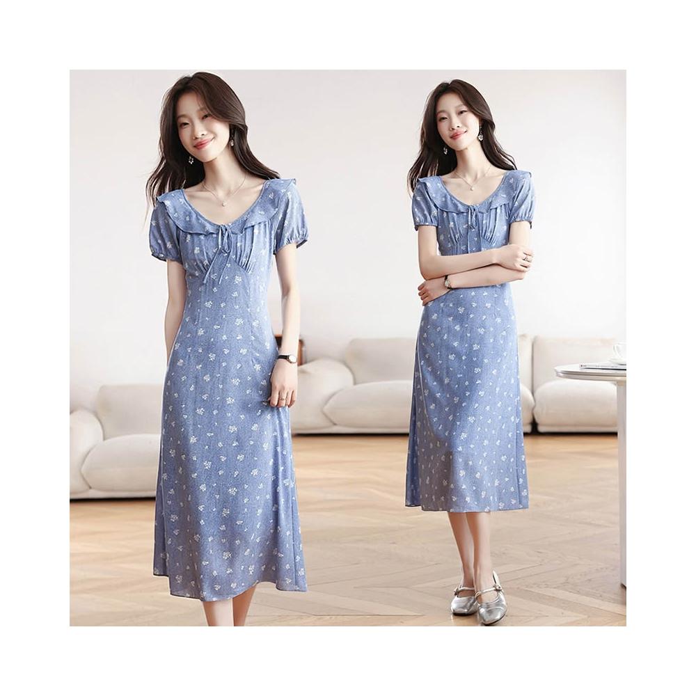 Seven七- . 碎花連衣裙2026夏季新款女裝泡泡袖收腰V領仿牛仔日系娃娃裙