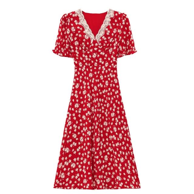 Seven七- . 曼日花事 紅色泡泡袖碎花連衣裙女春夏法式v領度假長裙