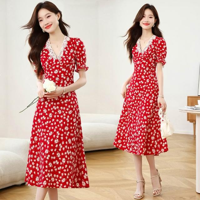 Seven七- . 曼日花事 紅色泡泡袖碎花連衣裙女春夏法式v領度假長裙