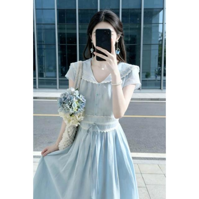 Seven七- 法式高級感藍色娃娃領連衣裙子女夏季2026年新款氣質收腰顯瘦長裙