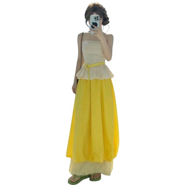 Seven七- 海邊度假抹胸背心套裝連衣裙子女夏季2026新款多巴胺黃色花苞長裙