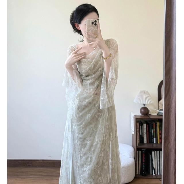 Seven七- 早春2026新款蕾絲罩衫吊帶連衣裙子女漂亮超火穿搭一整套魚尾長裙