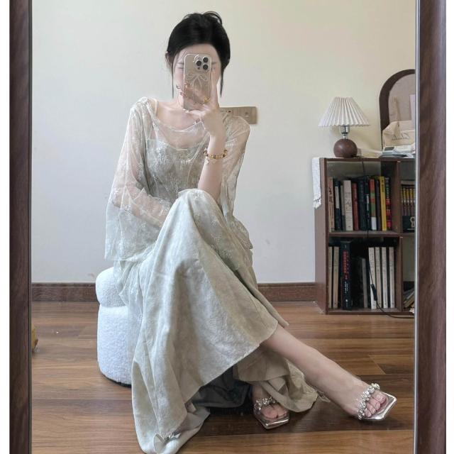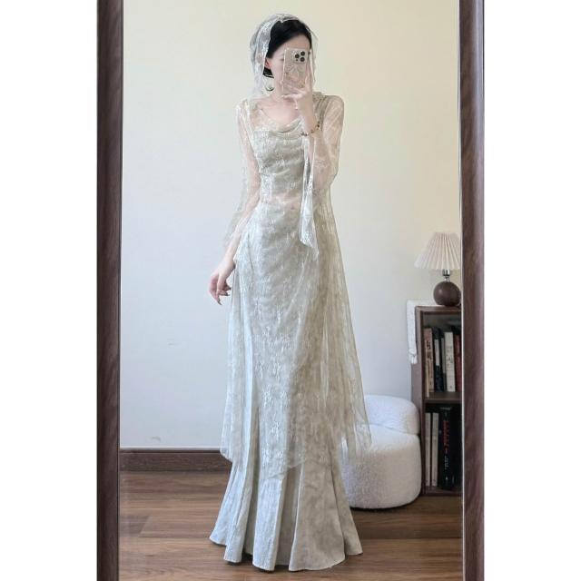 Seven七- 早春2026新款蕾絲罩衫吊帶連衣裙子女漂亮超火穿搭一整套魚尾長裙