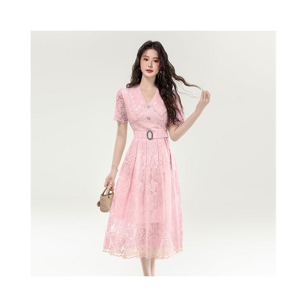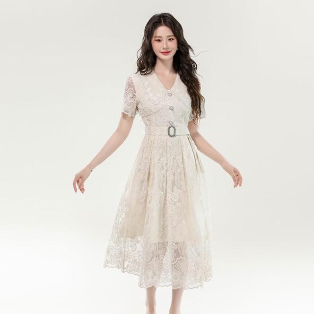Seven七- . 新款富家千金長裙子镂空蕾絲刺繡收腰大擺連衣裙