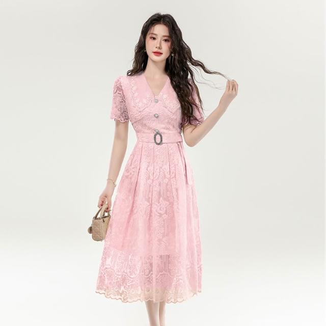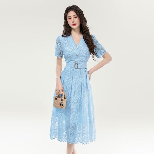 Seven七- . 新款富家千金長裙子镂空蕾絲刺繡收腰大擺連衣裙