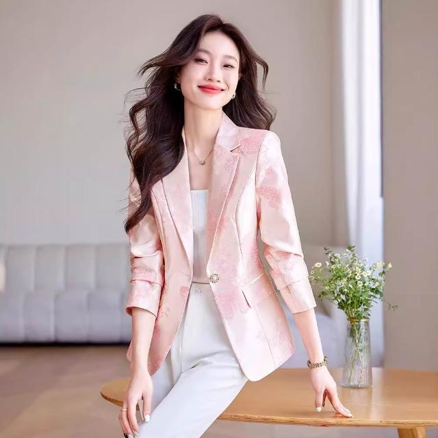 Seven七- 粉色提花醋酸緞面西裝外套女士秋季一粒扣修身顯瘦氣質女神範西服