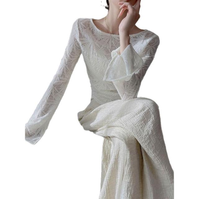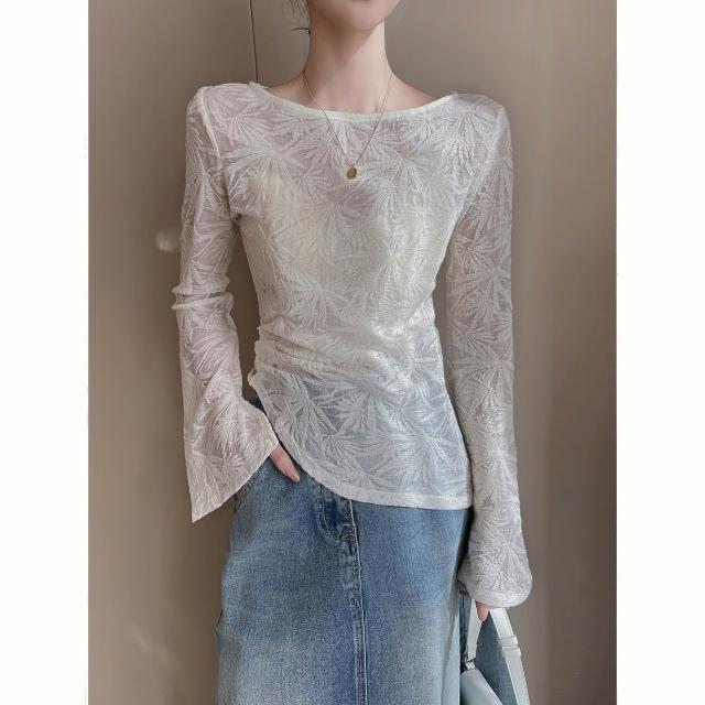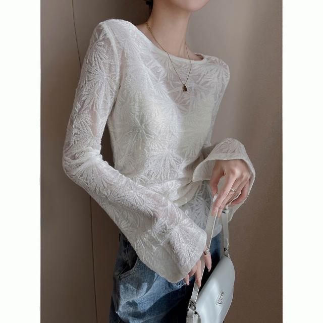 Seven七- 春季2026新收腰顯瘦氣質蕾絲上衣法式米白色圓領長袖镂空T恤女